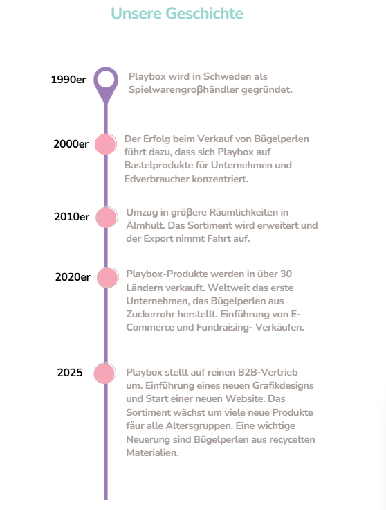 Das Jhr 2025 markiert einen Meilenstein für Playbox. Wir führen ein neues grafisches Profil und eine neue Website ein, die unserer Marke einen moderneren Ausdruck verleihen. Gleichzeitig verändern wir unsere Arbeitsweise: Ab sofort verkaufen wir ausschlieβlich an Unternehmen, Schulen und andere Institutionen. Dies ermöglicht es uns, uns voll und ganz auf unsere Geschäftskunden zu konzentrieren und einen noch besseren Service sowie Produkte anzubieten, die Endverbraucher anschlieβend problemlos bei unseren Partnerhändlern finden können. Zudem erweitern wir unser Sortiment um viele spannende Neuheiten. Unter anderem bringen wir unsere ersten Bügelperlen aus recyceltem Material auf den Markt- ein wichtiger Schritt in unserem Engagement für die Umwelt.