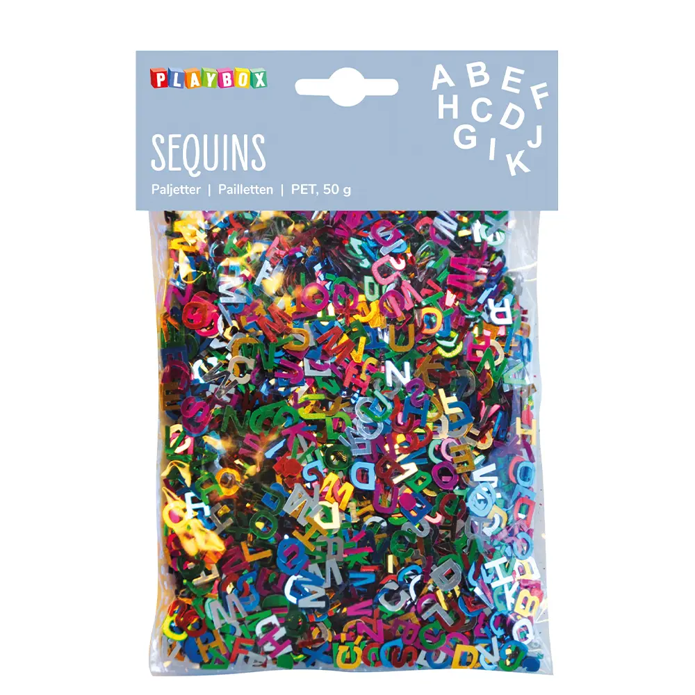 Sequins with letter motifs in many lovely colours. Create your own words and then paste them on a drawing, postcard, or other device that you wish to decorate and personalize.