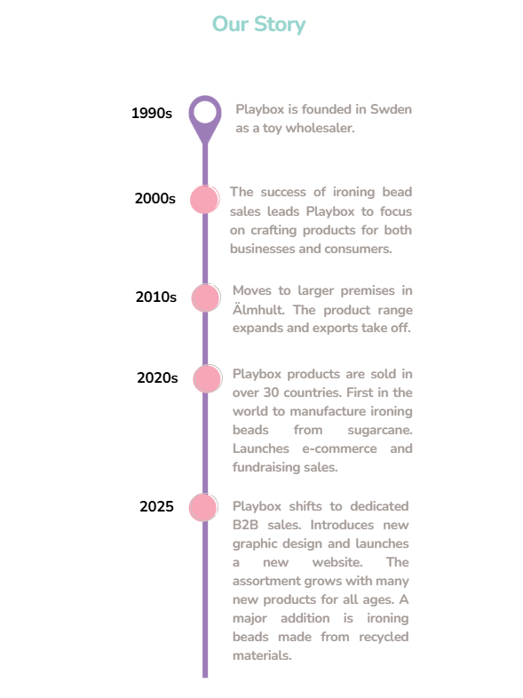 Today, Playbox products are sold in over 30 countries, with Sweden and Germany being our largest markets. We supply retailers, schools and also sell directly to customers.