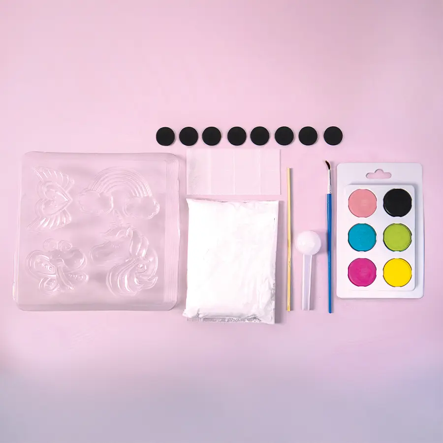 Pysselsetet innehåller allt du behöver för att gjuta och måla åtta söta magneter i gips. Perfekt för regniga dagar, kreativa stunder eller som en rolig present till pysselsugna barn! Setet in-nehåller en form med fyra olika figurer, gipspulver, vattenfärger, pensel och magneter. Det är bara att blanda, gjuta och låta fantasin flöda. Ett enkelt och roligt pyssel som utvecklar både kreativitet och finmotorik.