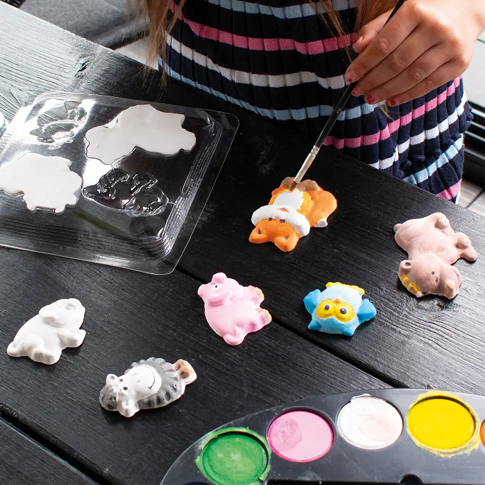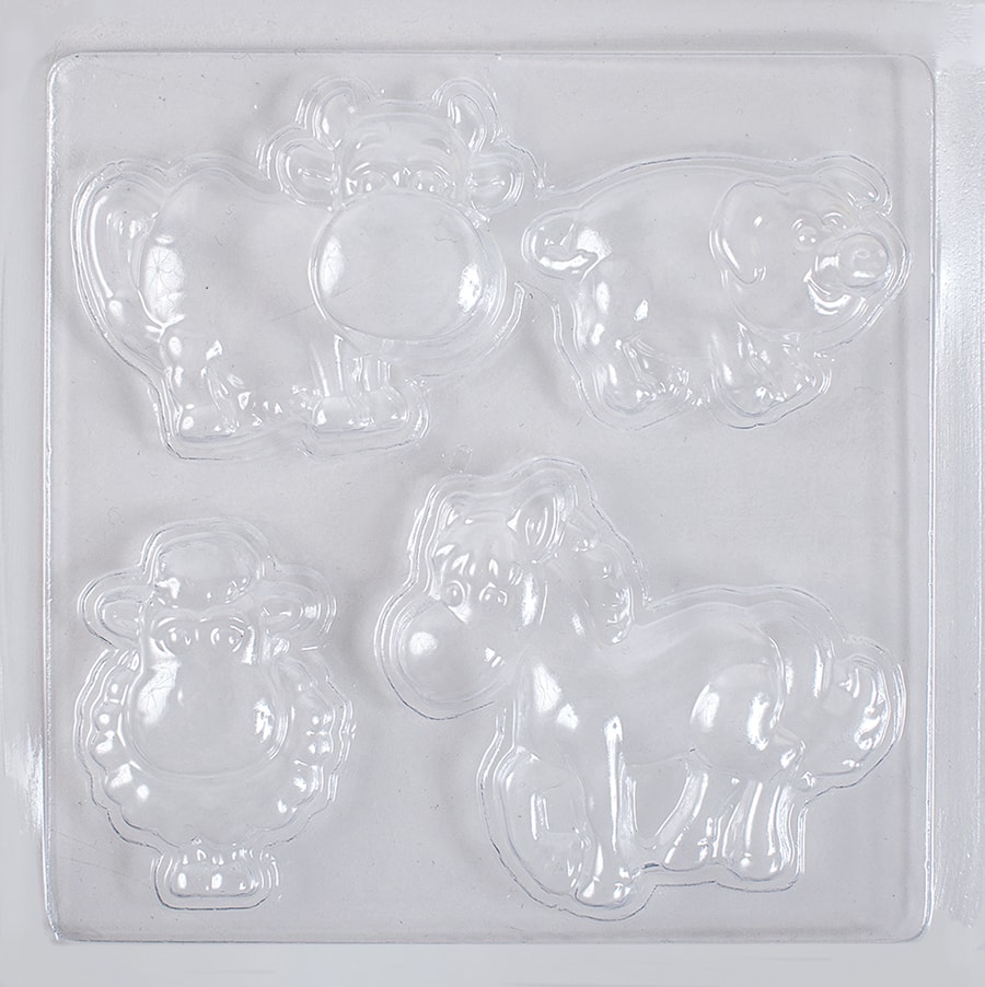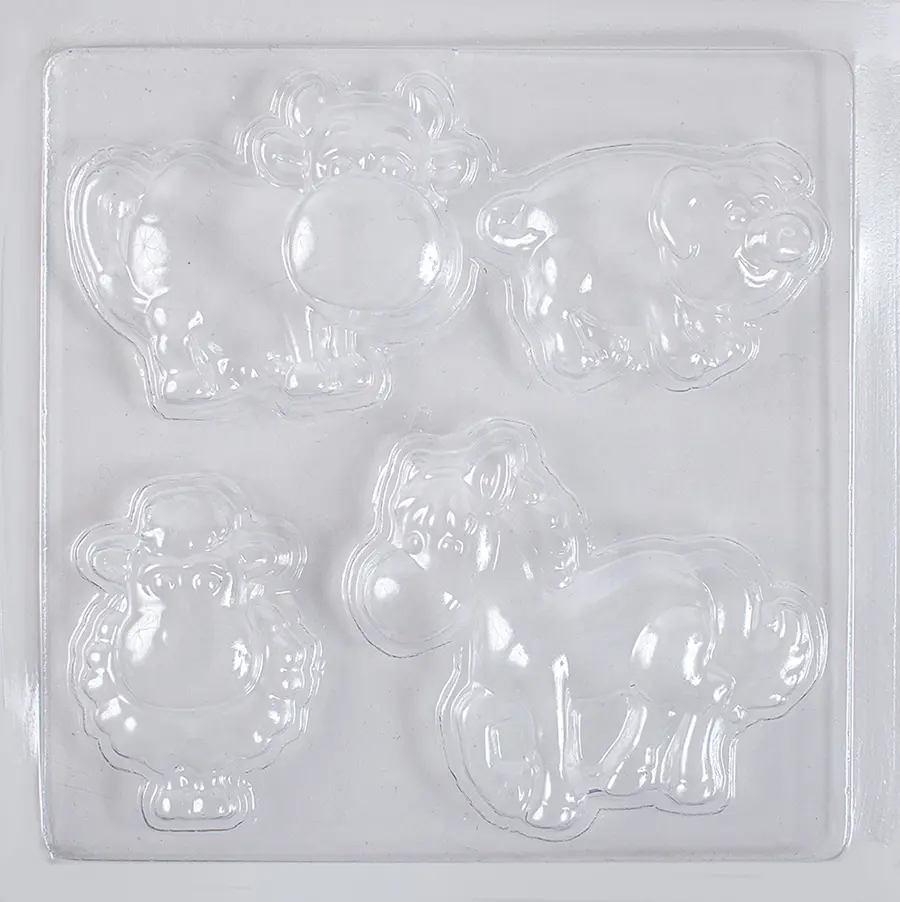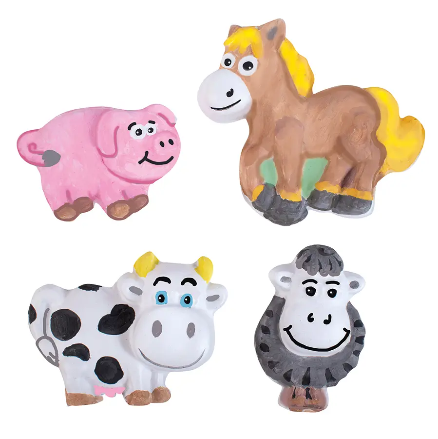 Gjutform med fyra olika bondgårdsdjur. Gjut gris, häst, ko och får i modellgips. När gipset torkat kan du färglägga djuren med vatten eller akrylfärg. Skapa magneter eller lek med figurerna som dem är.