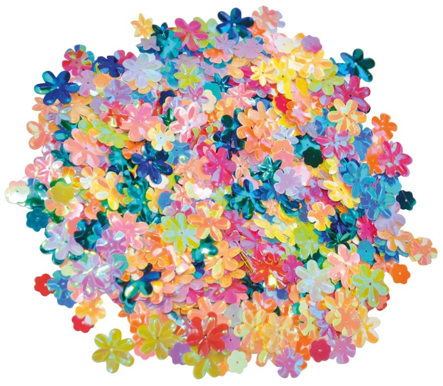 Paljetter med blommotiv och i många olika fina färger. Använd paljetterna för pyssel eller dekoration - klistra på vykort, paket, teckningar eller dekorera bord vid festligheter.