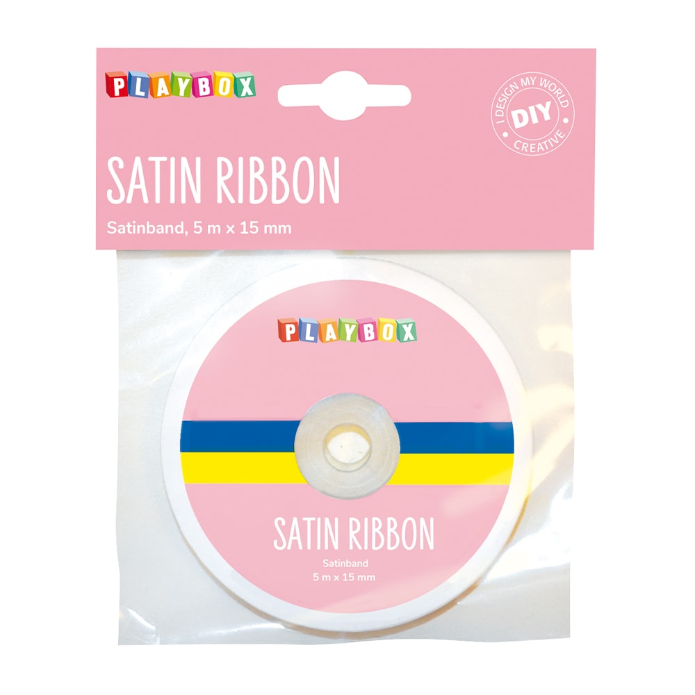 Gult och blått satinband. Med satinbandet kan du dekorera håruppsättningar, ballonger, presentaskar, inbjudningskort m.m. Satinbandet passar också till blomsterdekorering, paketinslagning och scrapbooking.