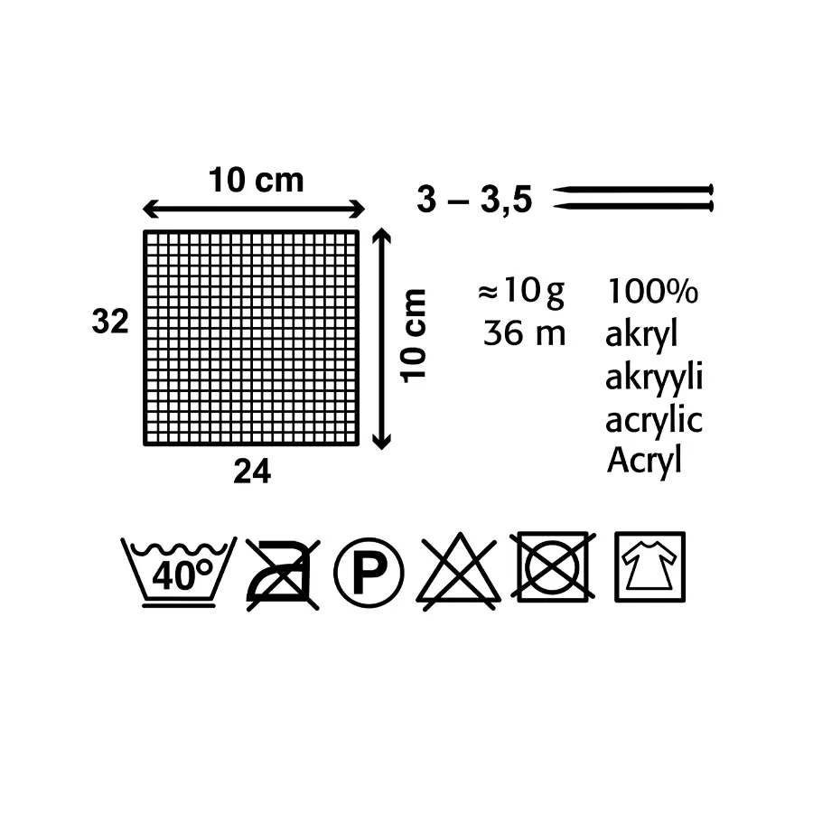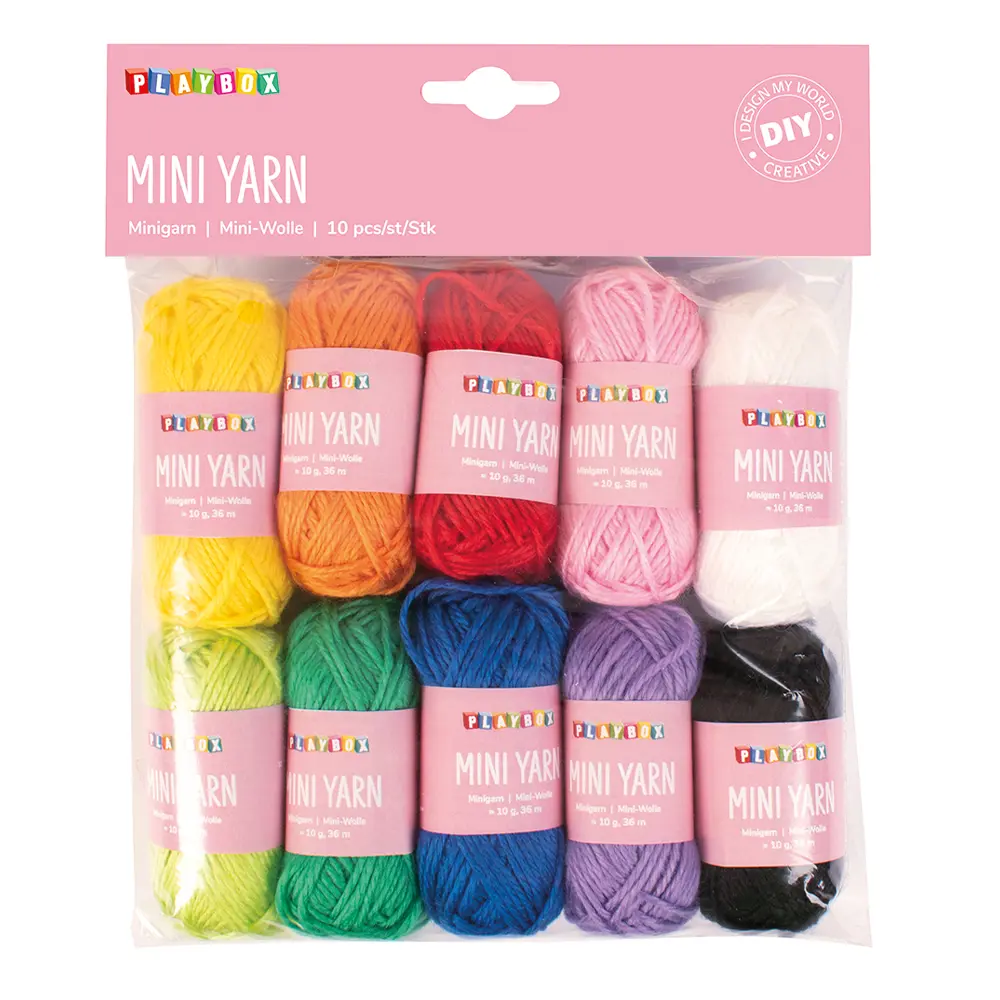 Mininystan i tio olika färger. Akrylgarnet är av hög kvalitet och har många praktiska egenskaper, kan med fördel användas till stickning, virkning, broderi och pysseltillverkning. Akrylgarnet är fritt från AZO-färger och formaldehyd.