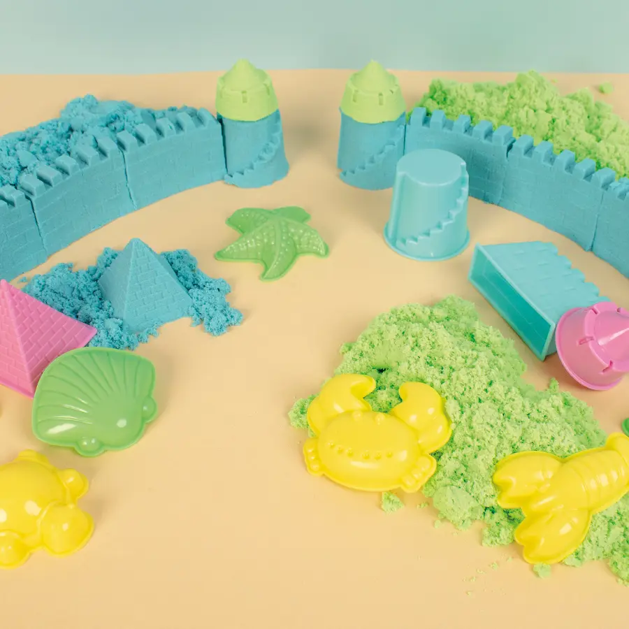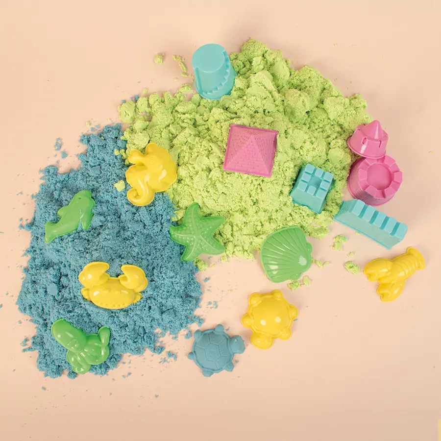 Leksand och sandformar packade i praktisk förvaringsväska. Den mjuka, magiska sanden är lätt att forma och klämma ihop så den håller formen. Sanden tillsammans med formarna är perfekt för att vara kreativ utan att bli kladdig eller smutsig. Sanden stimulerar sinnena och uppmuntrar till taktil och sensorisk lek, samtidigt som den erbjuder ett lugnande och rogivande pysselstund. Notera att sandens konsistens kan variera beroende på luftfuktigheten.