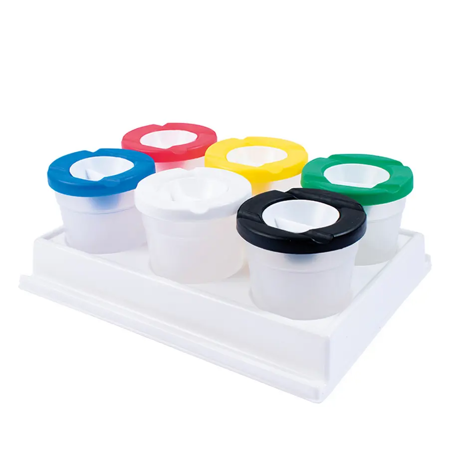 Mindre penselmuggar som står stadigt i sitt ställ. Det smarta och färgglada locket gör att du enkelt kan separera dina färger. Förpackning med 1 bricka och 6 muggar.