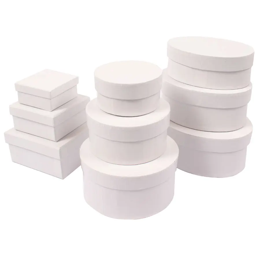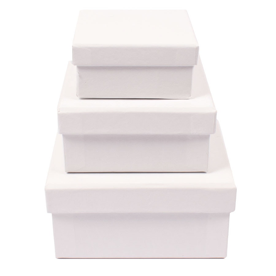 Fyrkantiga askar i tre olika storlekar. Askarna kan målas och dekoreras med pärlor och glitter och bli till små fina skattkistor. Passar bra till småförvaring.