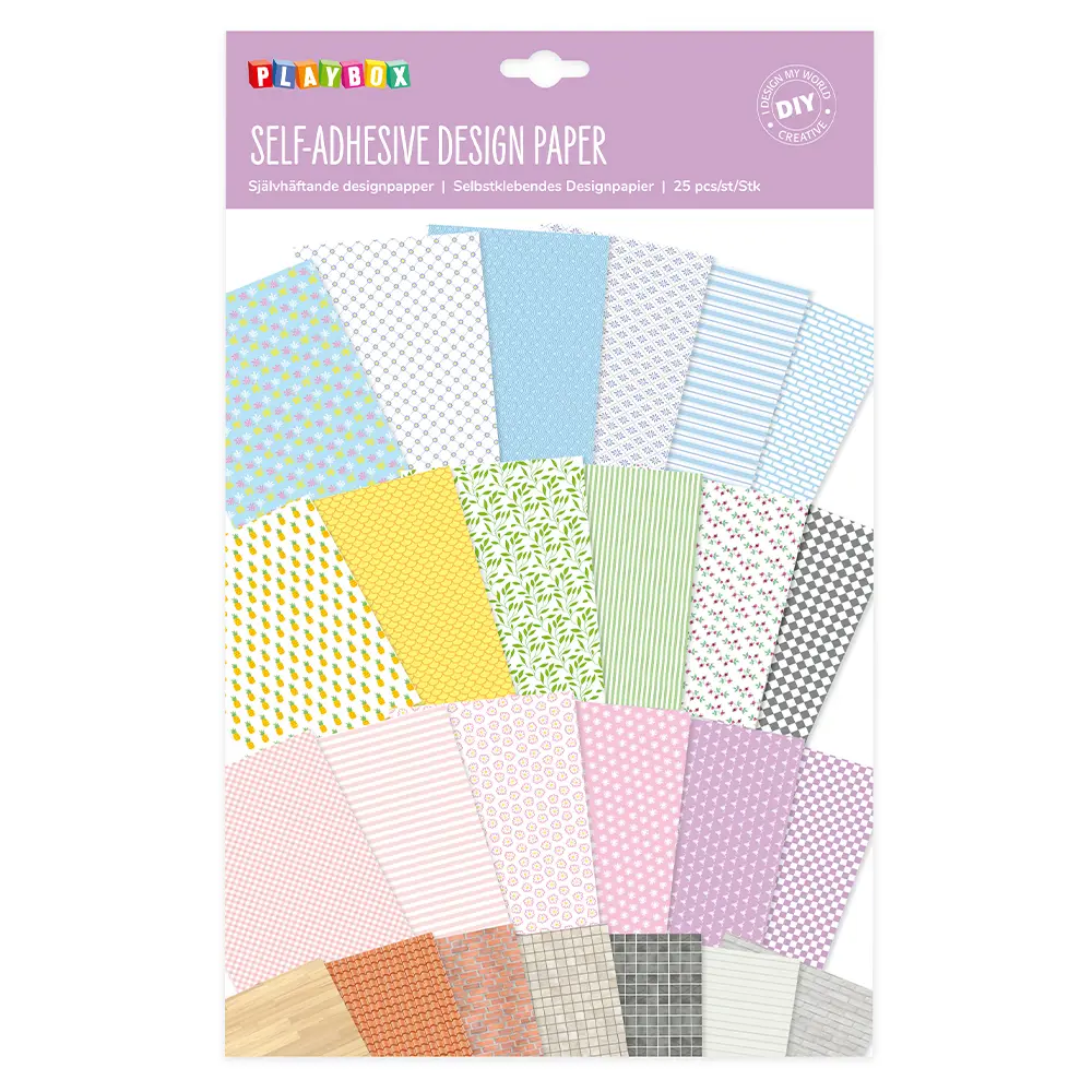 Dekorera askar, pennburkar eller tapetsera i dockhuset. Släpp fantasin fri med självhäftande designark i 25 olika mönster.