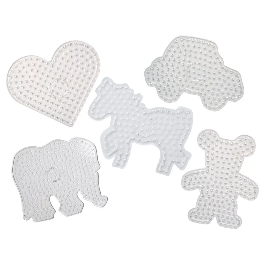 Pärlplattor för stora pärlor med motiv av häst, elefant, björn, hjärta och bil. Pärlplattorna är transparenta, vilket gör det enkelt att lägga motivkort under. Vi rekommenderar att använda våra XL-pärlor till pärlplattan.