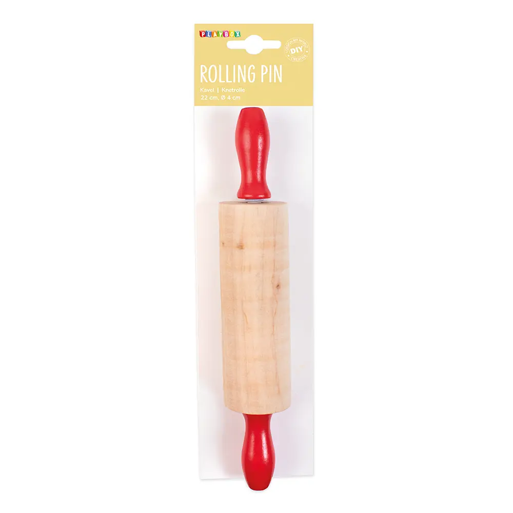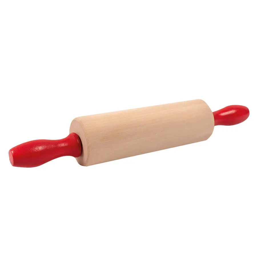 En slät kavel till den lilla bagaren. Använd till både pepparkakorna och till lättleran. Kaveln är i trä och har röda handtag. En perfekt liten lekkavel till barn