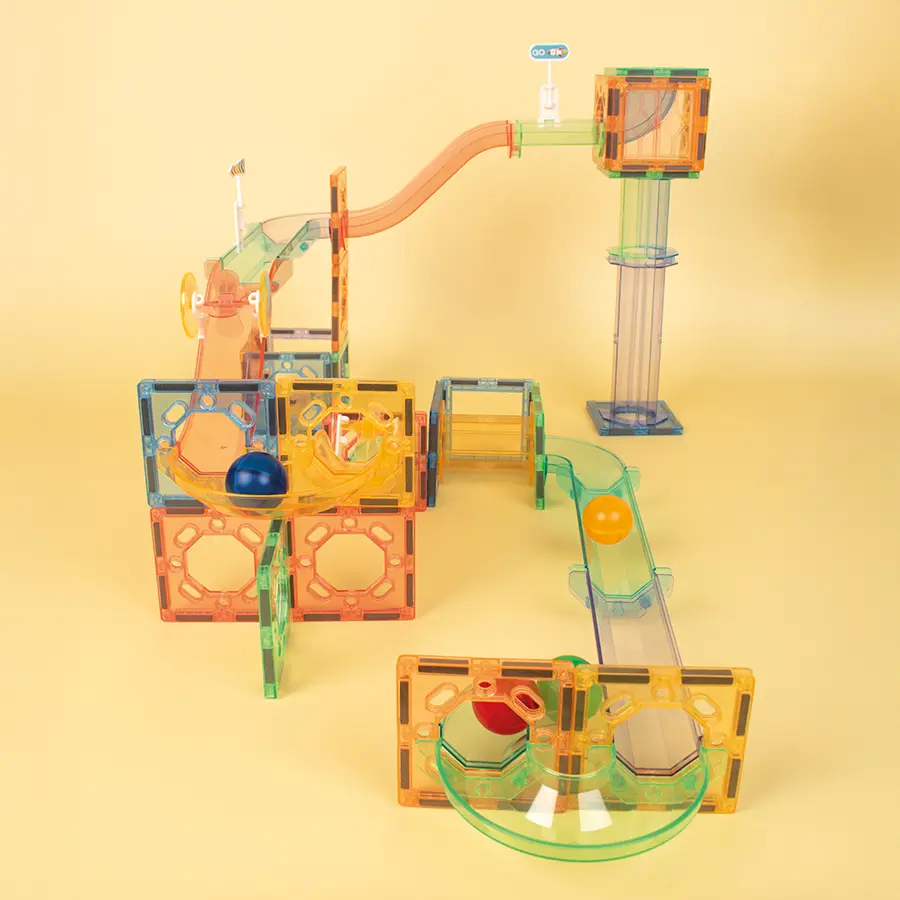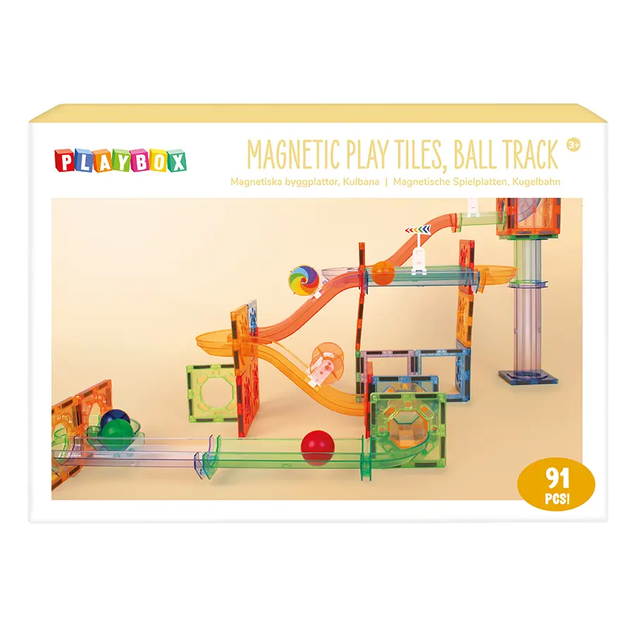 Skapa spännande kulbanor med detta set på 91 delar! Kombinationen av magnetiska och klickbara bitar gör det enkelt för barn att bygga stadiga och fantasifulla banor. Med 4 kulor som rullar genom banorna kan barnen tävla om vem som kommer i mål först. Leken stimulerar finmotorik, rumslig förmåga, problemlösning och kreativt tänkande. Ett säkert och hållbart set som följer med barnet i utvecklingen och uppmuntrar både självständig lek och samarbete.