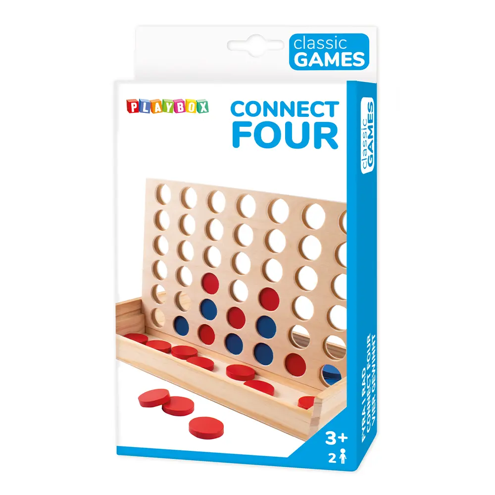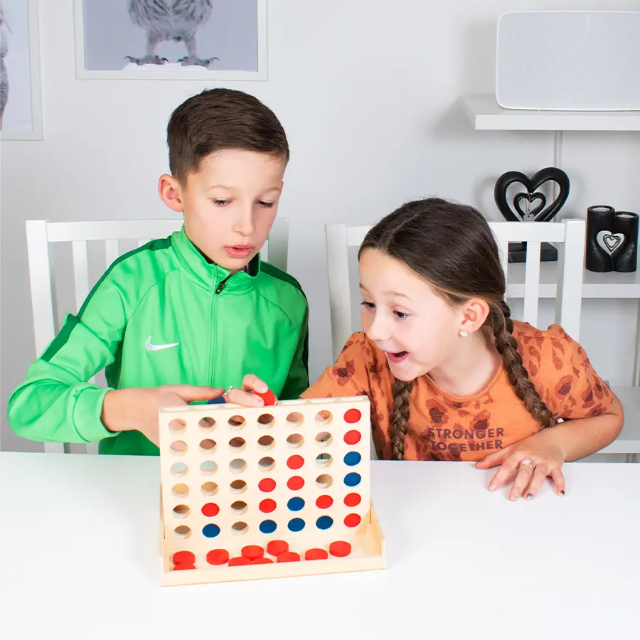 Klassiskt fyra i rad i trä. Utmana en vän för att se vem av er som först hinner få fyra i rad utan att bli stoppad. Roligt spel som passar bra för alla åldrar.