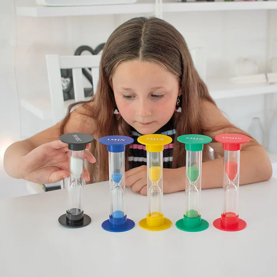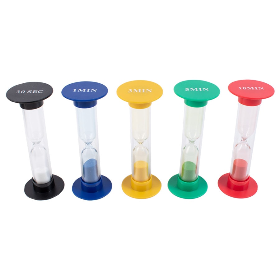 Hur många kullerbyttor kan du göra på 30 sekunder? Hur lång är en minut? Utforska och lär dig mer om tid med timglas. Använd timglasen för att tidsbegränsa arbetsuppgifter eller svarstid i spel. De fem timglasen mäter 30 sekunder, 1 minut, 3 minuter, 5 minuter och 10 minuter.