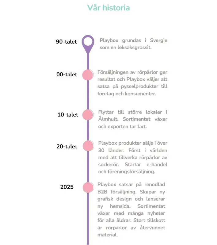 År 2025 händer mycket på Playbox. Vi lanserar en ny grafisk profil och en ny hemsida som ger ett modernare uttryck som speglar vårt varumärke. Samtidigt förändrar vi vårt sätt att arbeta. Från och med nu säljer vi bara till företag, skolor och andra verksamheter. Det gör att vi kan fokusera helt på våra företagskunder och erbjuda ännu bättre service och produkter som slutkunden sedan kan lätt hitta hos våra återförsäljare. Vi fyller också sortimentet med flera spännande nyheter. Bland annat lanserar vi våra första rörpärlor av återvunnet material- ett viktigt steg i vårt arbete för miljön.